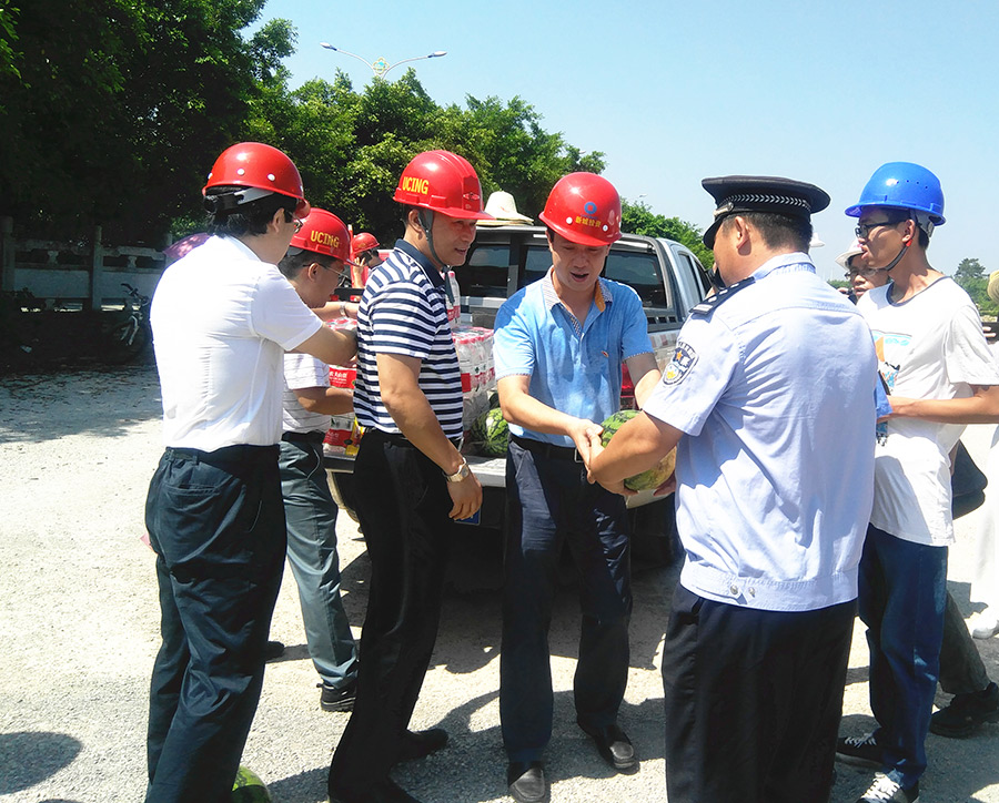 臨桂新區(qū)工委副書記、新區(qū)管委會(huì)副主任、新區(qū)黨總支書記唐標(biāo)明,臨桂新區(qū)工委委員、新區(qū)管委會(huì)副主任、機(jī)關(guān)工會(huì)主席文杰,新城投資集團(tuán)黨支部書記周道林,臨桂新區(qū)工委組織人事部部長(zhǎng)、黨總支紀(jì)檢委員梁利,新城投資集團(tuán)黨支部委員、新城投資集團(tuán)工會(huì)主席譚力源等領(lǐng)導(dǎo)將西瓜、飲用水等防暑降溫用品送到一線建筑工人手中。