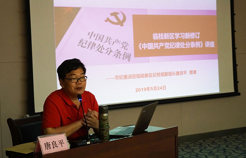 5月24日上午,臨桂新區(qū)舉辦《中國(guó)共產(chǎn)黨紀(jì)律處分條例》輔導(dǎo)講座。邀請(qǐng)市紀(jì)委派駐臨桂新區(qū)紀(jì)檢組副組長(zhǎng)唐良平同志作《中國(guó)共產(chǎn)黨紀(jì)律處分條例》輔導(dǎo)報(bào)告。臨桂新區(qū)工委副書(shū)記、管委會(huì)副主任唐標(biāo)明,臨桂新區(qū)工委委員、管委會(huì)副主任陳清,臨桂新區(qū)工委委員、管委會(huì)副主任文杰,臨桂新區(qū)工委委員、管委會(huì)副主任蔣玖明,新城投資集團(tuán)黨支部書(shū)記、總經(jīng)理周道林以普通黨員身份參加此次講座。臨桂新區(qū)黨總支全體黨員、預(yù)備黨員、發(fā)展對(duì)象及入黨積極分子參加學(xué)習(xí)。