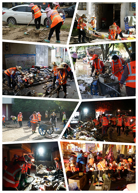 在龍船坪小區(qū)、安新小區(qū)、寧遠(yuǎn)小學(xué)及周邊街道,一群身著橘紅色馬甲、印有“宏謀環(huán)衛(wèi)”的環(huán)衛(wèi)工人成為了救災(zāi)現(xiàn)場(chǎng)的一道亮麗風(fēng)景線。他們不畏艱難,深一腳淺一腳地踩在垃圾堆和泥漿中,一鍬一鍬地清理垃圾和淤泥?,F(xiàn)場(chǎng)工作人員齊心協(xié)力,面對(duì)困難毫不退縮,甚至唱起了《團(tuán)結(jié)就是力量》來鼓舞士氣。經(jīng)過晝夜奮戰(zhàn),他們終于將小區(qū)道路上的垃圾清運(yùn)完畢,有效保障了道路的正常通行和居民的出行安全,及時(shí)防止災(zāi)后疫情的發(fā)生。