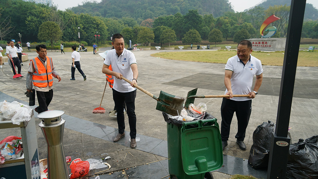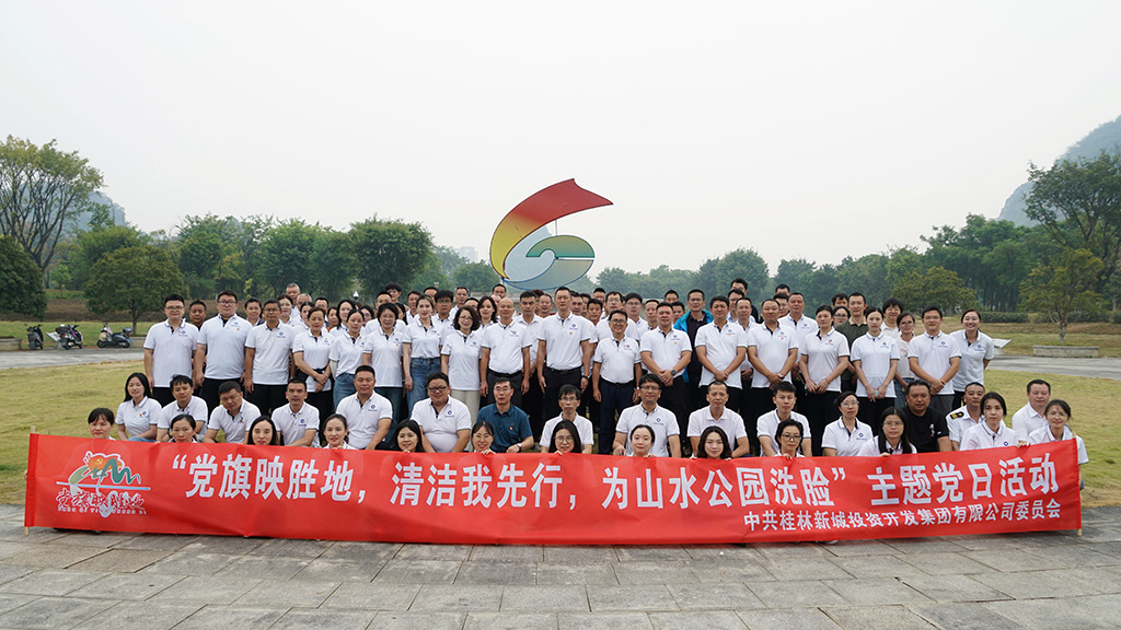 山水公園作為桂林新區(qū)的一張亮麗名片,承載著展現(xiàn)城市風貌的重要使命。在國內(nèi)經(jīng)濟下行、財政支持相對不足的情況下,桂林新城投資開發(fā)集團有限公司(簡稱“新城投集團”)勇挑重擔,為政府承擔起公園日常維護之責。2024年10月14日新城投集團立足自身實際,充分發(fā)揮黨組織戰(zhàn)斗堡壘作用和黨員先鋒模范作用,廣泛動員黨員干部沖鋒在前,以實際行動踐行初心使命,積極開展“黨旗映勝地,清潔我先行,為山水公園洗臉”主題黨日活動,這一行動,既為了維護桂林的良好形象,又切實保障了市民的生活舒適度。集團黨委副書記(主持工作)、副董事長、總經(jīng)理朱毅攜公司領(lǐng)導班子成員黨委副書記兼紀委書記譚力源,黨委委員、董事、副總經(jīng)理葉青旺,黨委委員、董事、副總經(jīng)理何萌,董事、副總經(jīng)理劉敏,第一、第二、第三黨支部全體黨員(含預備黨員)、發(fā)展對象、入黨積極分子、遞交入黨申請書員工共100余名黨員干部參加活動。