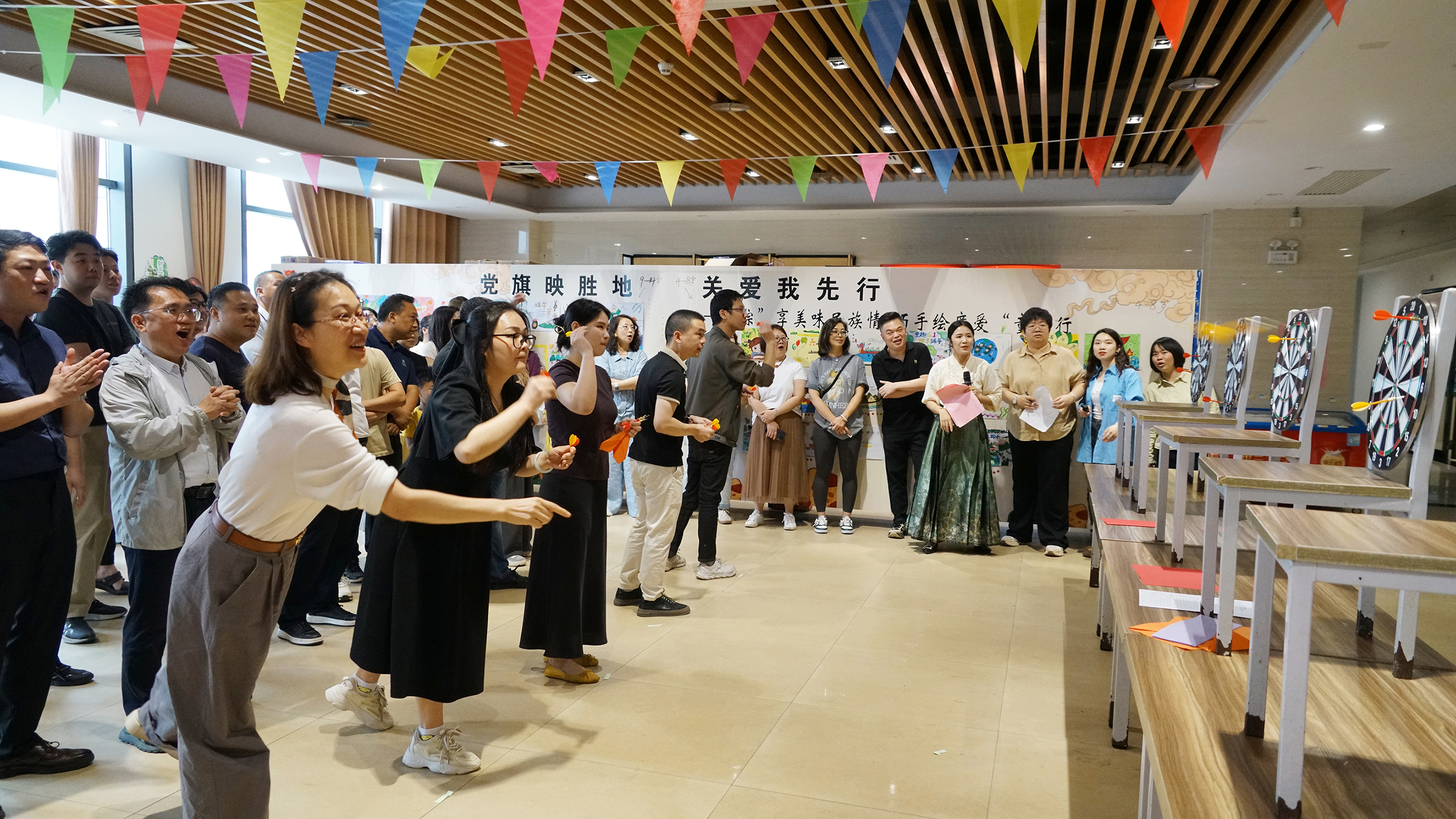 “家企同行·國風(fēng)非遺——民族文創(chuàng),與‘粽’不‘童’”趣味游戲挑戰(zhàn)環(huán)節(jié),將活動氛圍推向高潮。童年紙飛機、端午射五毒、趣味投壺三大趣味游戲讓職工與孩子都沉浸其中。在童年紙飛機游戲中,為了能讓紙飛機飛得更遠(yuǎn)、更久,大家興致勃勃地嘗試著各種折法,隨后用力一擲,紙飛機在空中劃出一道道優(yōu)美的弧線,有的飛得又高又遠(yuǎn),有的則在空中翻轉(zhuǎn)幾圈后穩(wěn)穩(wěn)落地,看著自己折的紙飛機歡呼雀躍,仿佛回到了無憂無慮的童年時光。端午射五毒游戲則充滿了傳統(tǒng)韻味,大家手持飛鏢,瞄準(zhǔn)靶心,每當(dāng)有人射中五毒圖案,周圍就會響起一陣歡呼聲,大家在歡聲笑語中感受著端午節(jié)的傳統(tǒng)習(xí)俗。趣味投壺游戲更是熱鬧非凡,參與者們瞄準(zhǔn)壺口,或站或蹲,調(diào)整著姿勢和力度,隨著一次次投中,現(xiàn)場的氣氛也一次次被點燃,歡呼聲、加油聲此起彼伏。歡聲笑語回蕩在整個活動現(xiàn)場。各組成員在比賽中相互配合、相互鼓勵,展現(xiàn)了團隊合作的力量。最終,根據(jù)各組獲得的總分,評選出冠軍組,大家在歡樂中感受到了團隊的溫暖與力量。