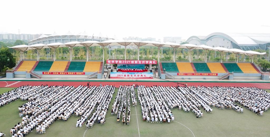9月17日上午,桂林學(xué)院2021級(jí)新生開學(xué)典禮在學(xué)校田徑場舉行。2021級(jí)來自全國各地的3160名新生和新生親友通過現(xiàn)場與視頻直播相結(jié)合的形式,共同參加和觀看了開學(xué)典禮。桂林學(xué)院董事長周道林,桂林學(xué)院校長楊樹喆以及學(xué)校董事、監(jiān)事、校領(lǐng)導(dǎo)出席典禮。各二級(jí)學(xué)院、職能教輔部門主要負(fù)責(zé)人,各黨總支書記、副書記,全體新生輔導(dǎo)員,教師代表,校友代表參加典禮。開學(xué)典禮由校黨委書記唐文紅主持。