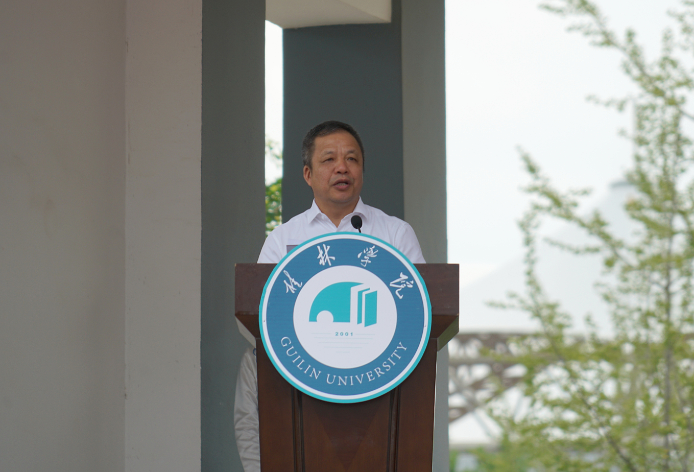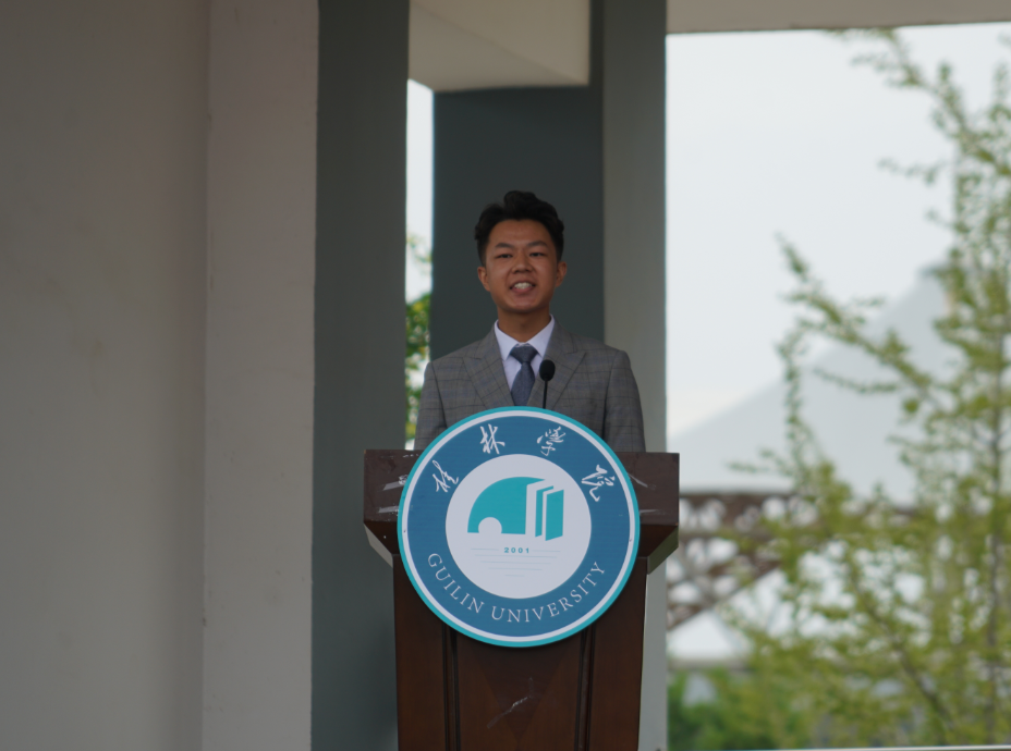 “云中的神啊,霧中的仙,神姿仙態(tài)桂林的山!情一樣深啊,夢一樣美,如情似夢漓江的水!水幾重啊,山幾重?水繞山環(huán)桂林城……”,周道林以中國當(dāng)代詩人賀敬之的《桂林山水歌》為開場白,向從五湖四海來到桂林學(xué)院的莘莘學(xué)子們表達(dá)最誠摯的問候與歡迎。