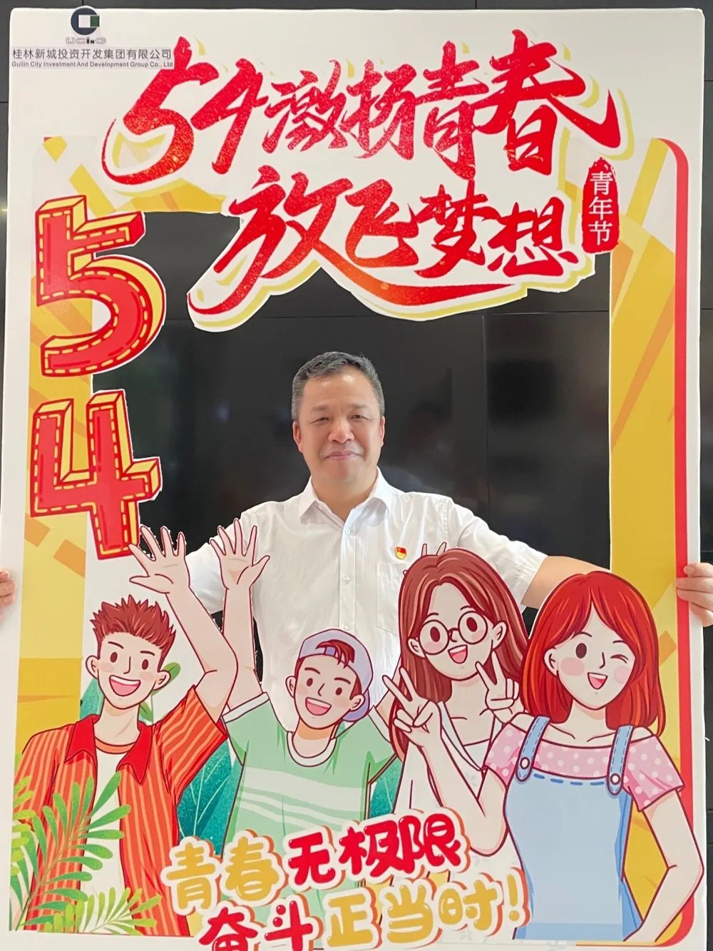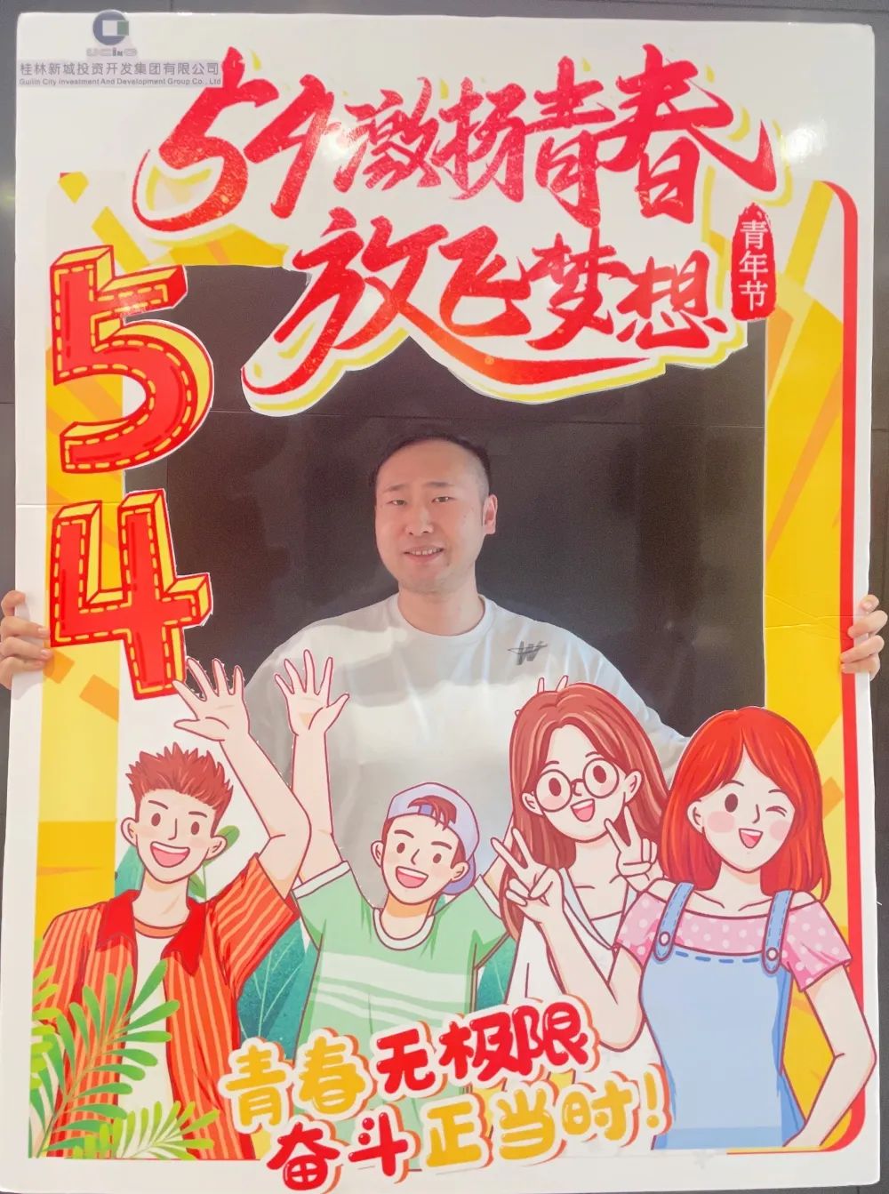 公司一樓大廳,團支部布置了“五四主題”畫框打卡活動,熱烈慶祝五四青年節(jié)到來。周道林帶頭打卡,并鼓勵全體員工積極參與拍照打卡活動,渲染喜慶的節(jié)日氛圍。