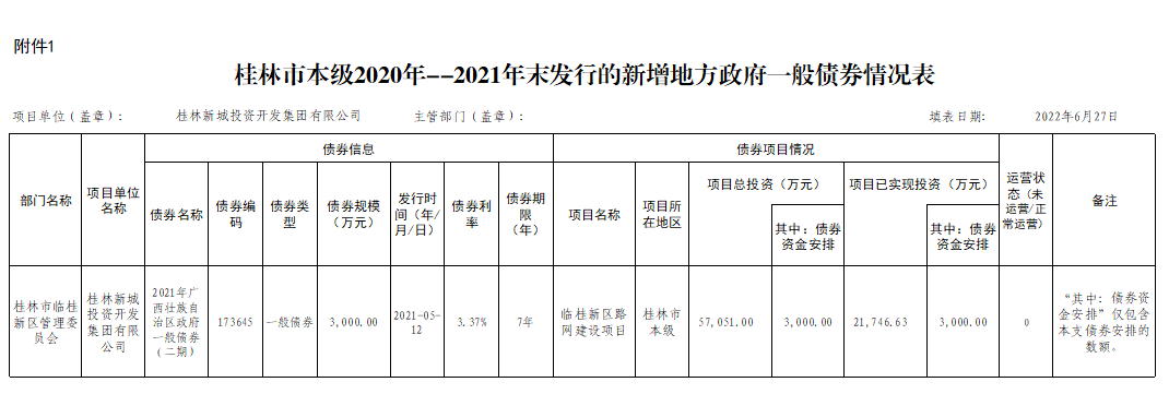 截至2021年末,桂林新城投資開發(fā)集團有限公司及所屬單位獲得2021年新增政府一般債券資金3,000.00萬元,安排用于本部門及所屬單位1個項目,其中:臨桂新區(qū)路網建設項目3,000.00萬元。從項目實施進度看,臨桂新區(qū)路網建設項目總投資57,051萬元,其中2021年債券資金安排3,000.00萬元;截至2021年末已實現投資21,746.63萬元,其中2020年債券資金安排3,000.00萬元。從項目運營情況看,截至2021年末,該項目尚在建設期未開始進行運營。