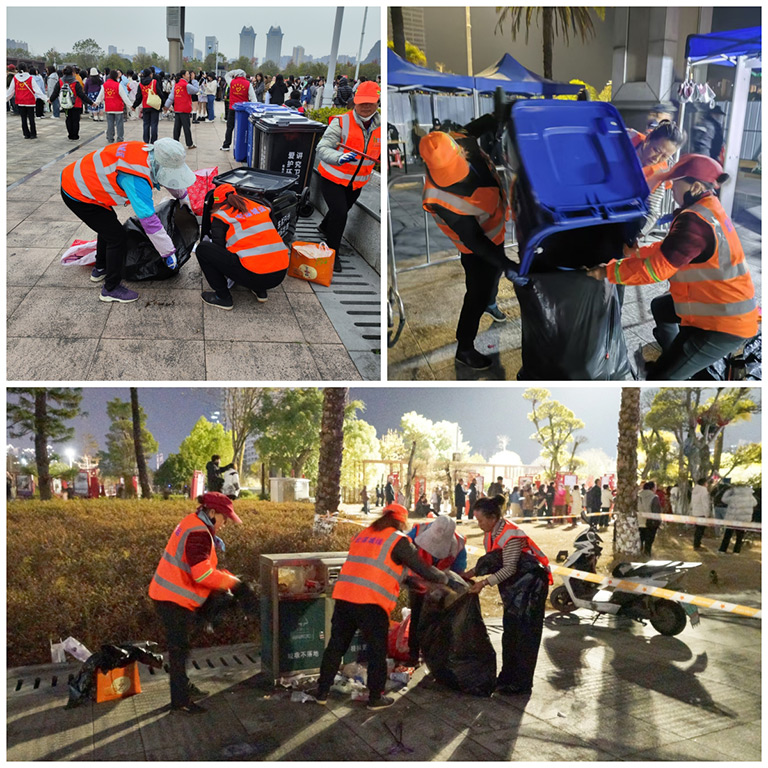 為營造整潔有序的活動氛圍,公司積極履行活動現(xiàn)場環(huán)境衛(wèi)生保障職責,出動了10余名保潔人員及2臺垃圾清運車組成“清潔衛(wèi)士”隊伍,對廣場內(nèi)的塑料飯盒、礦泉水瓶、包裝袋、發(fā)光棒、煙頭等垃圾進行“地毯式”清理,同時對廣場周邊的28個垃圾桶進行合理調(diào)整布局,增加垃圾清運次數(shù),做到垃圾不堆積、不滯留?;顒赢斕?,“清潔衛(wèi)士”隊伍加大清掃頻次,延長保潔時間,及時發(fā)現(xiàn)并解決環(huán)境衛(wèi)生問題,共為800名工作、安保人員及上千名觀眾清理了260余包垃圾?;顒忧昂?2天,清理枯枝落葉、舞臺垃圾等總計達5噸,確保活動場地環(huán)境舒適與衛(wèi)生。