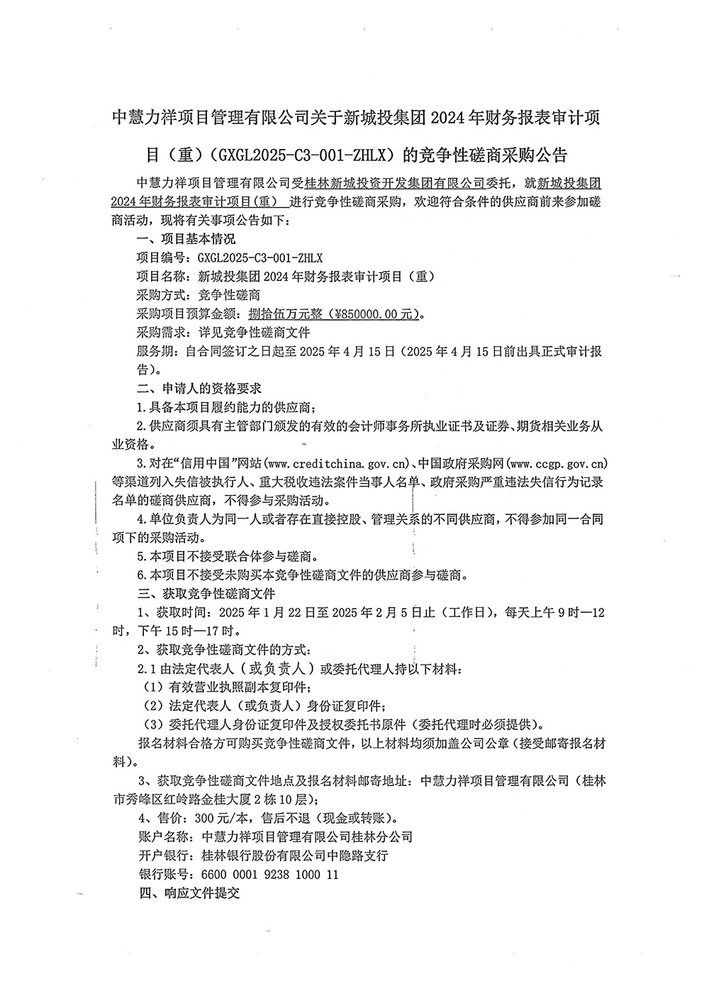 中慧力祥項(xiàng)目管理有限公司關(guān)于新城投集團(tuán)2024年財(cái)務(wù)報(bào)表審計(jì)項(xiàng)目(重)(GXGL2025-C3-001-ZHLX)的競(jìng)爭(zhēng)性磋商采購公告