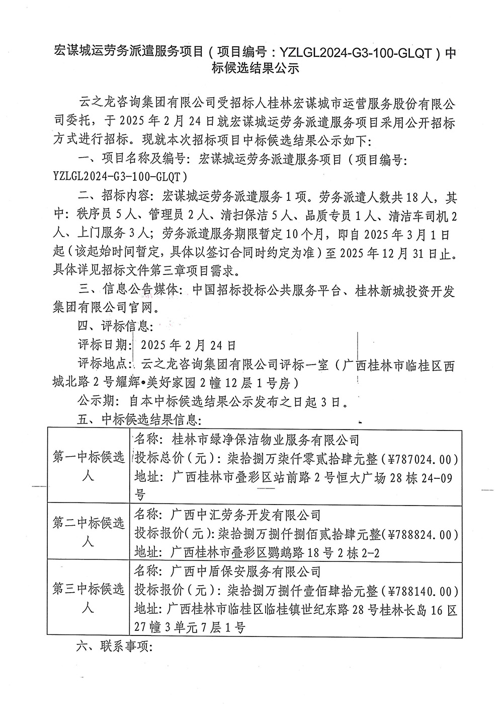 宏謀城運(yùn)勞務(wù)派遣服務(wù)項(xiàng)目(項(xiàng)目編號(hào):YZLGL2024-G3-100-GLQT)中標(biāo)候選結(jié)果公示
