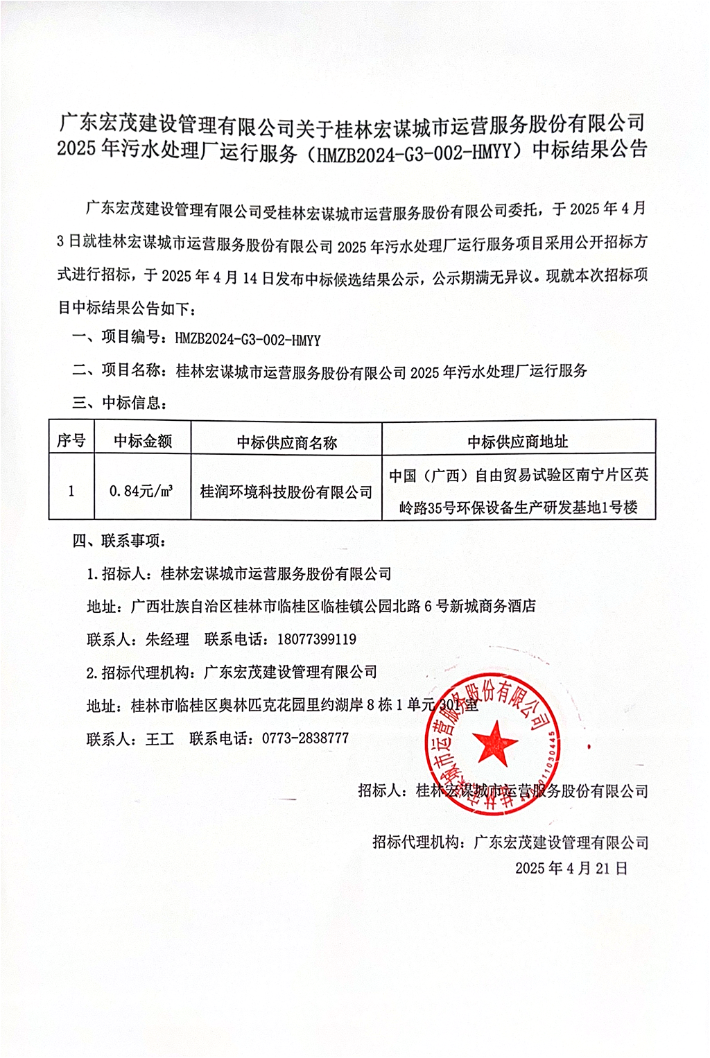 廣東宏茂建設(shè)管理有限公司關(guān)于桂林宏謀城市運(yùn)營(yíng)服務(wù)股份有限公司2025年污水處理廠運(yùn)行服務(wù)(HMZB2024-G3-002-HMY)中標(biāo)結(jié)果公告