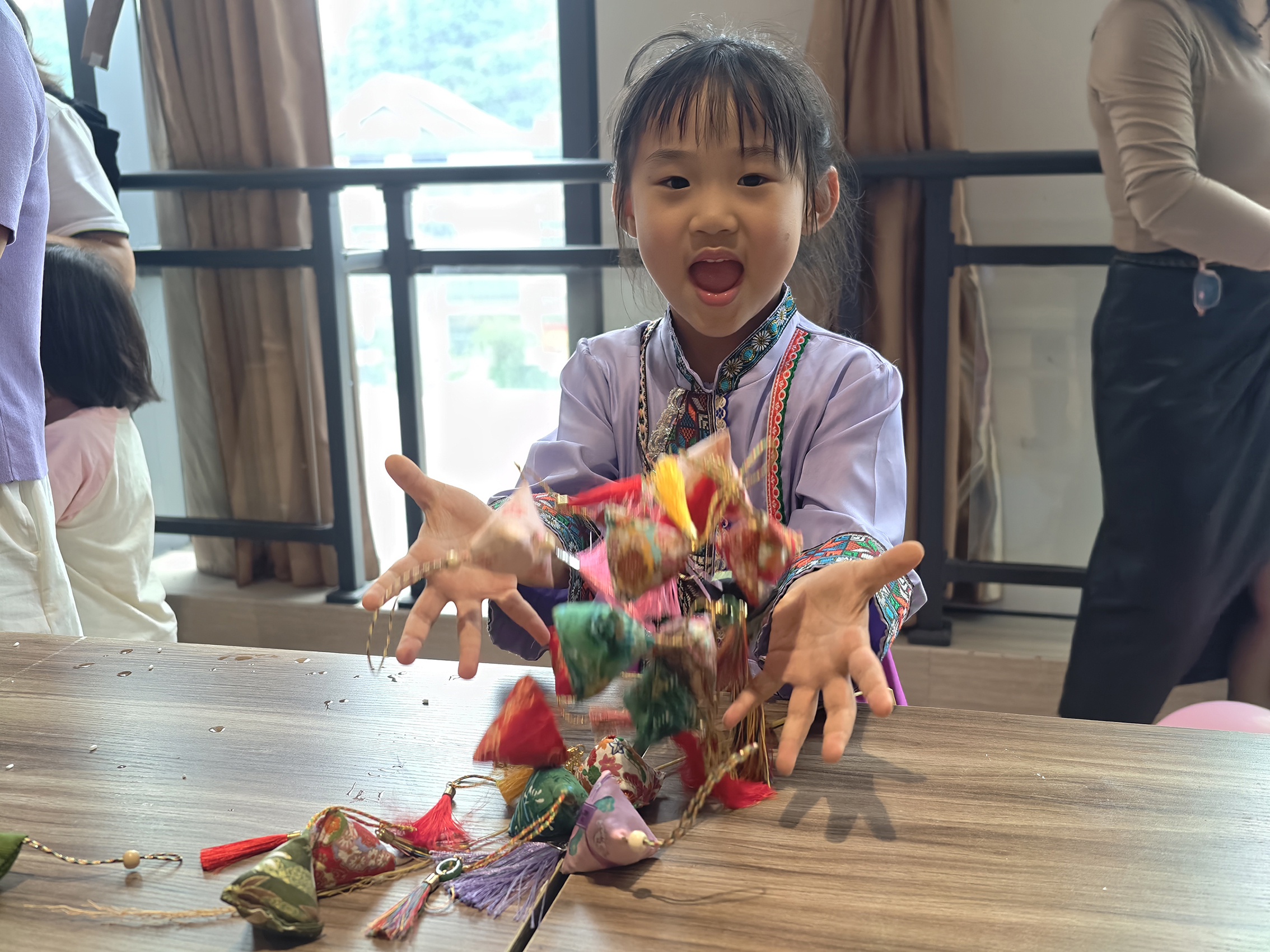 游戲環(huán)節(jié)結(jié)束后,大家開始包粽子、做香囊,孩子們圍著長桌,小手笨拙又興奮地學(xué)著大人的模樣包粽子、做香囊,翠綠寬大的粽葉在他們手中顯得有些調(diào)皮,不是卷不成錐形,就是裹不緊邊角。另一邊的角落,則是五彩斑斕的香囊世界,孩子們圍坐在一起,桌上鋪滿了色彩鮮艷的綢布、五彩絲線、亮晶晶的小珠子,還有散發(fā)著濃郁草藥香氣的艾草和菖蒲碎。他們用小手仔細地挑選著心儀的布料,小心翼翼地裁剪成小小的口袋形狀。穿針引線對他們來說是個不小的挑戰(zhàn),小眉頭微微蹙起,線頭有時會調(diào)皮地打結(jié),但他們依然樂此不疲。通過包粽子、做香囊使孩子們深入了解中國各民族在端午節(jié)的悠久歷史和豐富的非遺傳承文化,感受到傳統(tǒng)文化的獨特魅力。