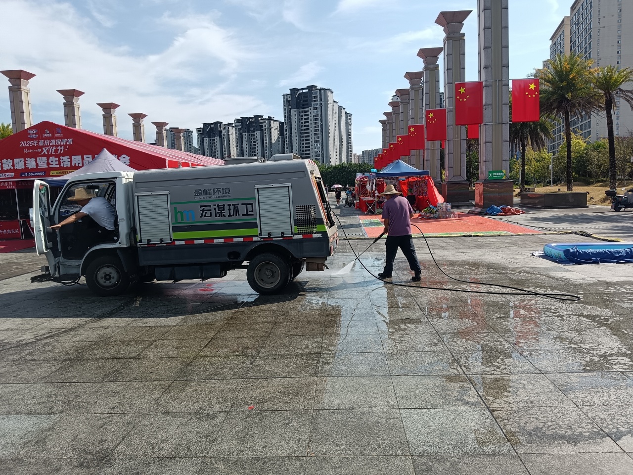 現(xiàn)場清潔:環(huán)衛(wèi)清洗車每日早晚高壓清洗地面,清除油污污漬,保障環(huán)境整潔。